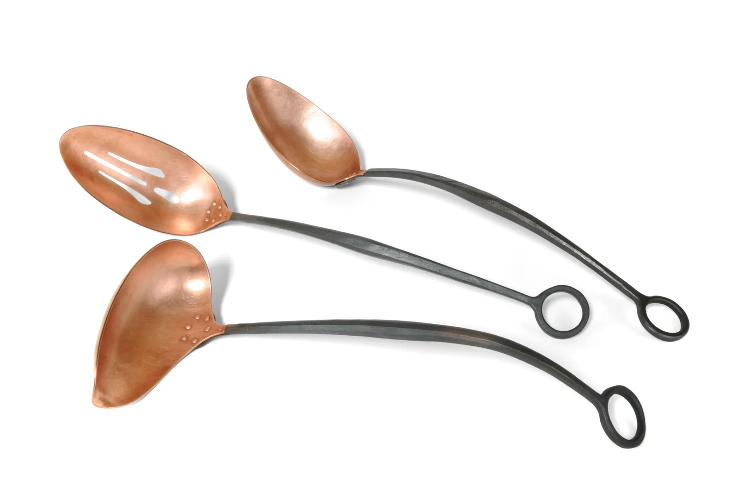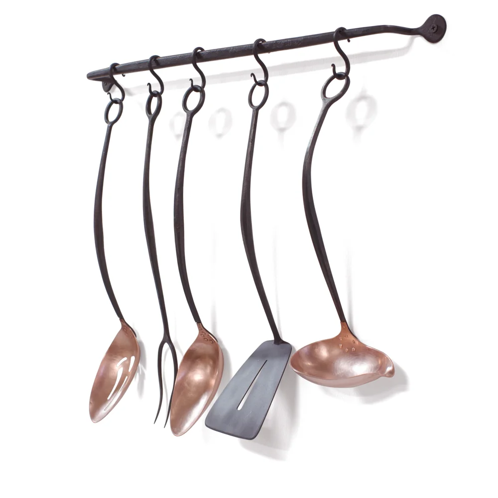Smith Shop’s Signature Servingware is an heirloom quality set that is carefully crafted from hand forged steel and formed copper. The copper and steel serving pieces are riveted together for a solid mechanical connection that is both hard wearing and elegant. The set includes five serving pieces, five s-hooks and a hanging bar. Individual pieces also sold separately. When hung the on the display bar the set measures 22 inches wide, 17 inches long, and 2 inches deep. Available for purchase in our online store.
